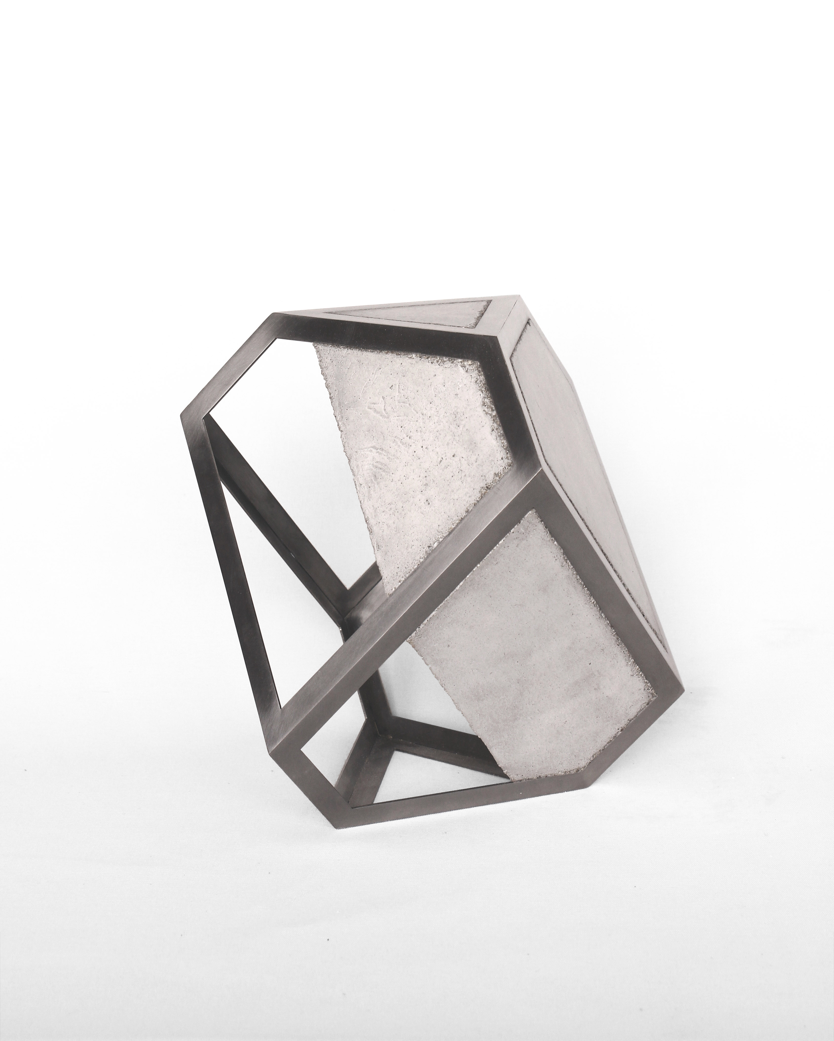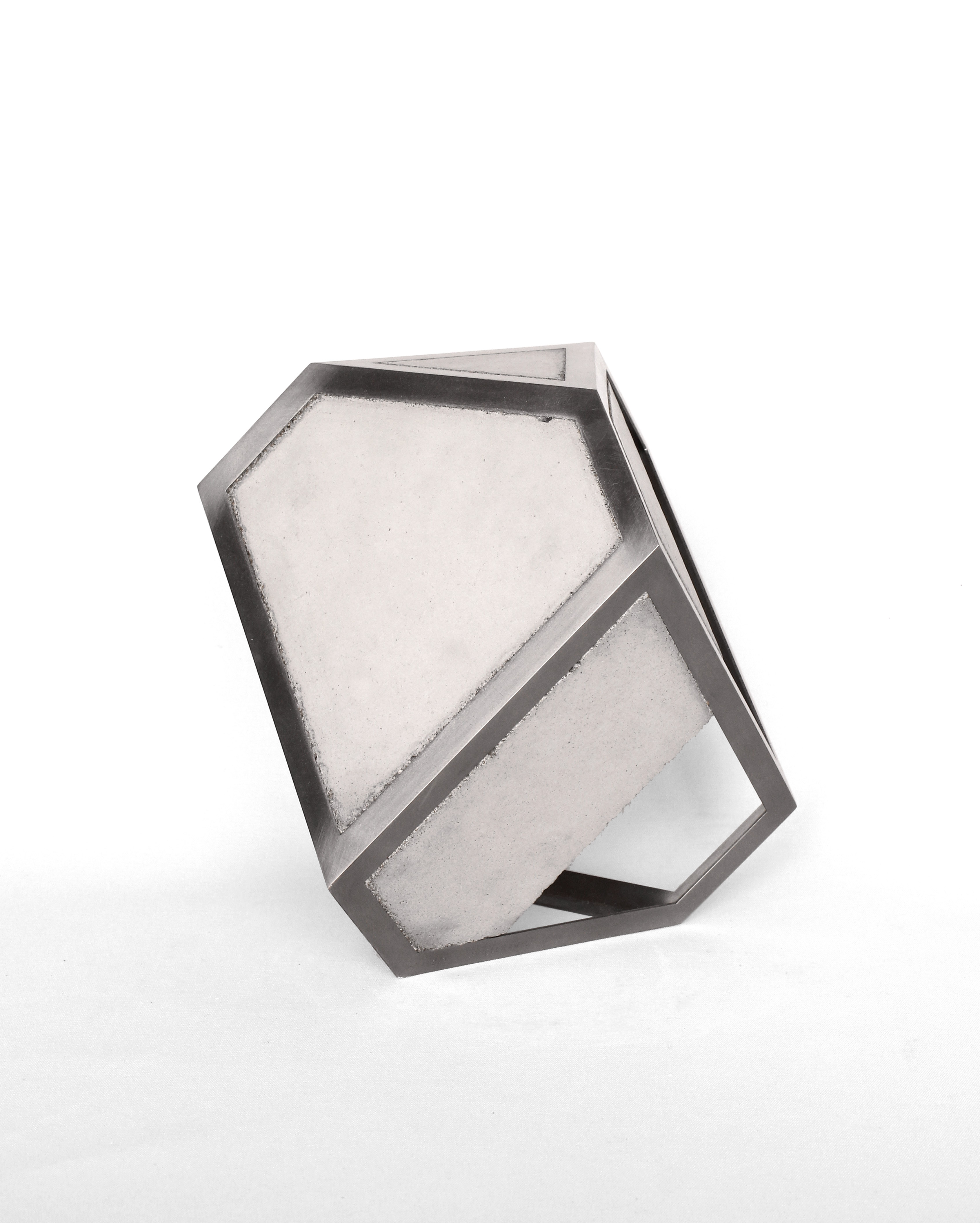 Cette sculpture est inspirée de la célèbre gravure Melencolia I du peintre et théoricien Albrecht Dürer : une œuvre emblématique de l’Histoire de l’Art qui suscite depuis des siècles l’intérêt des mathématiciens et physiciens. On trouve dans cette œuvre de 1514, de nombreux éléments symboliques et énigmatiques parmi lesquels se démarque un étrange polyèdre. Le dénommé Solide de Dürer est tel un gros morceau de granit taillé en polyèdre. Il suggère de multiples questionnements car sa représentation en deux dimensions ne permet pas de définir avec exactitude les différents plans, angles, et dimensions qui en font sa nature. La sculpture que j’ai appelée Melencolia est une interprétation plastique de ce solide suivant la représentation démontrée en 1999 par le mathématicien allemand Peter Schreiber. L'ossature du polyèdre est rigoureusement construite en acier inoxydable suivant les proportions définies par ce dernier. Ses huit faces ajourées permettent une vision « en transparence » de l'ensemble du volume, révélant ainsi les mystères de sa géométrie si controversée. Rempli de moitié avec du béton, il est disposé de manière à ce que la masse minérale semble renversée. Cette matière rappelle alors le bloc de granit de la célèbre gravure, et les mystères dont il est chargé.