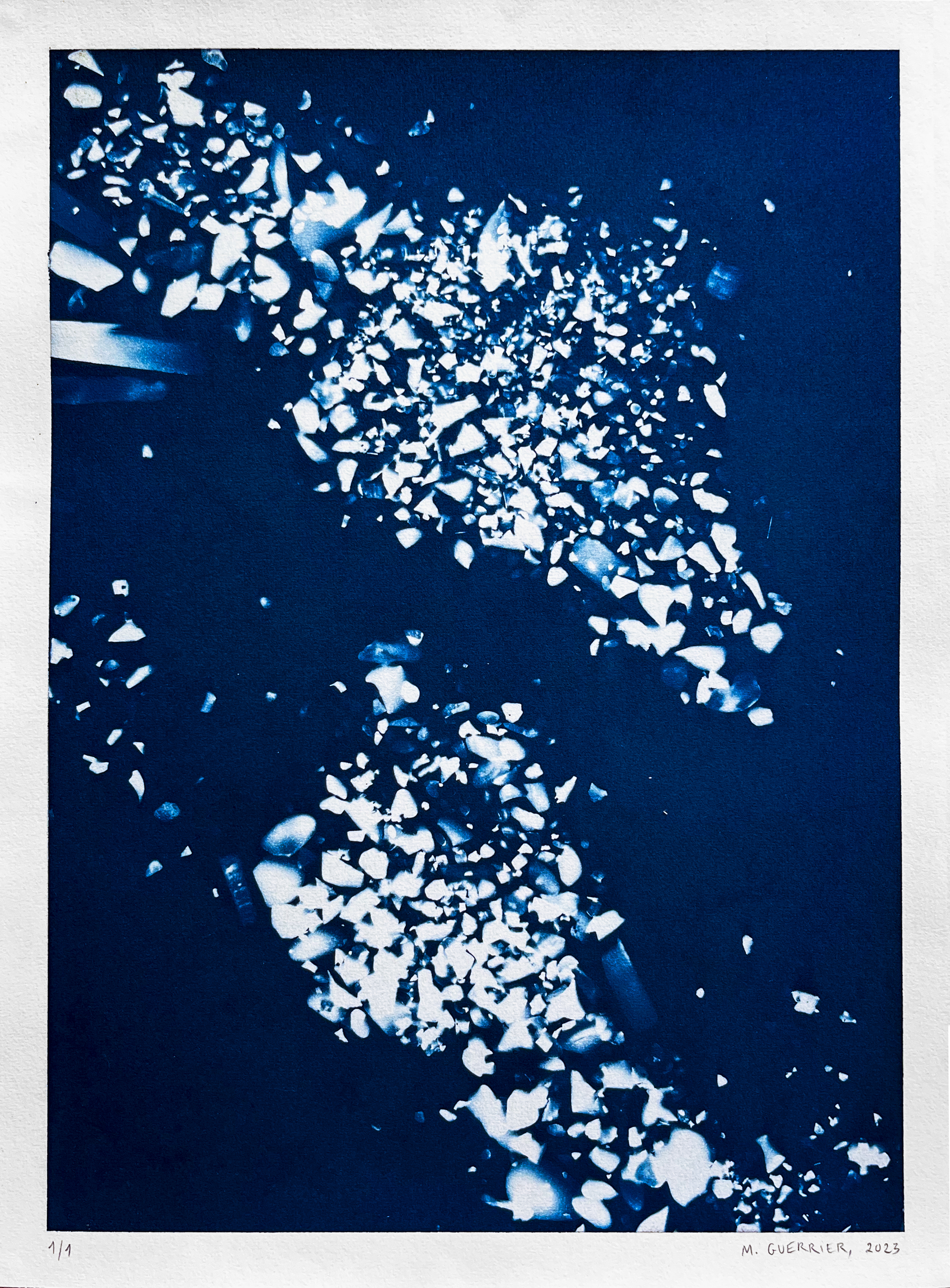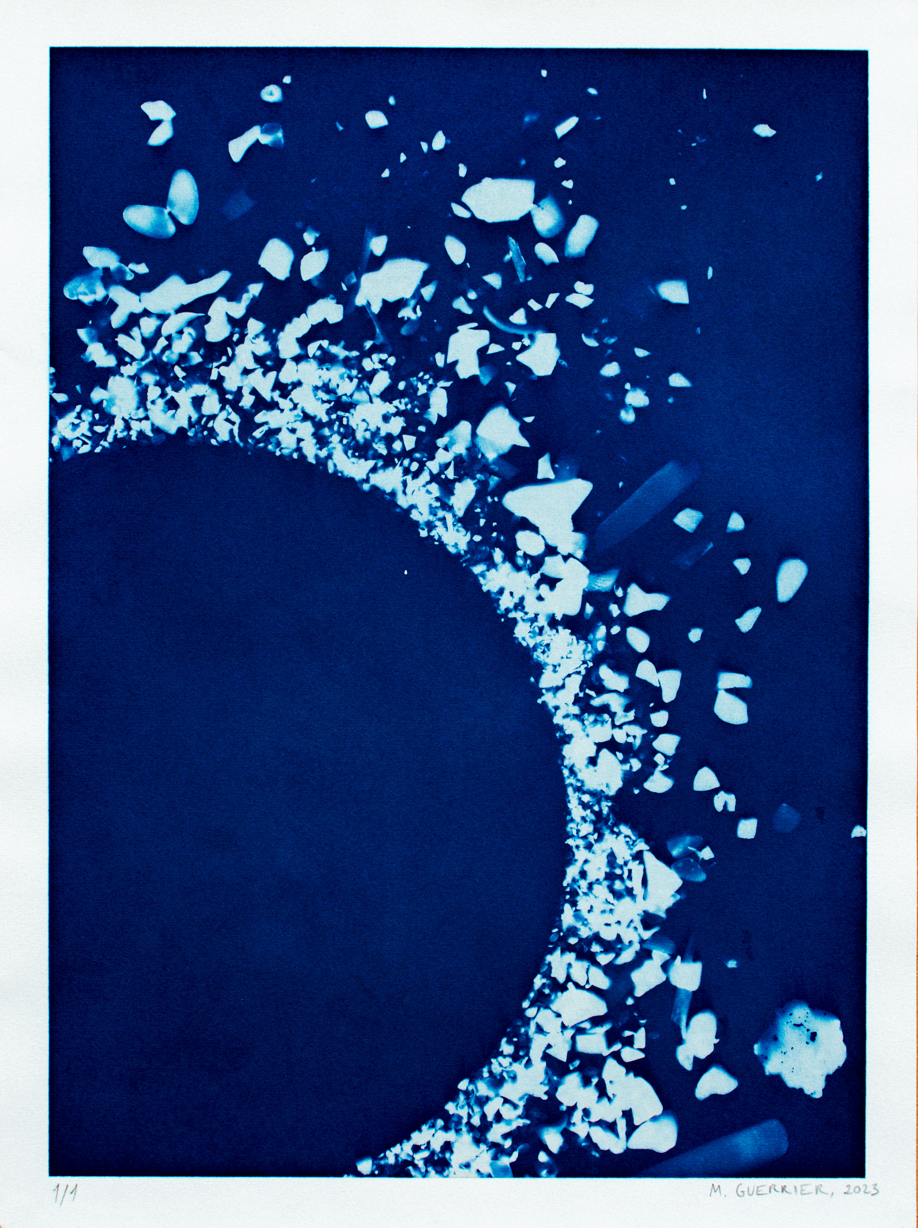 Dans le cadre de la résidence HOMA à Cova do Vapor (Caparica, Portugal, été 2023), j'ai choisi de découvrir le procédé photographique ancien du cyanotype et de développer un projet d'impressions avec les matières minérales présentes dans mon environnement. Les Sédiments sont des débris de mer : morceaux de coquillage, grains de sable et couteaux, ramassés lors de mes ballades sur la plage de Cova. Par des compositions structurées ou chaotiques, j’ai gardé sur le papier l’empreinte de leur silhouette, la trace de leur matière diaphane.